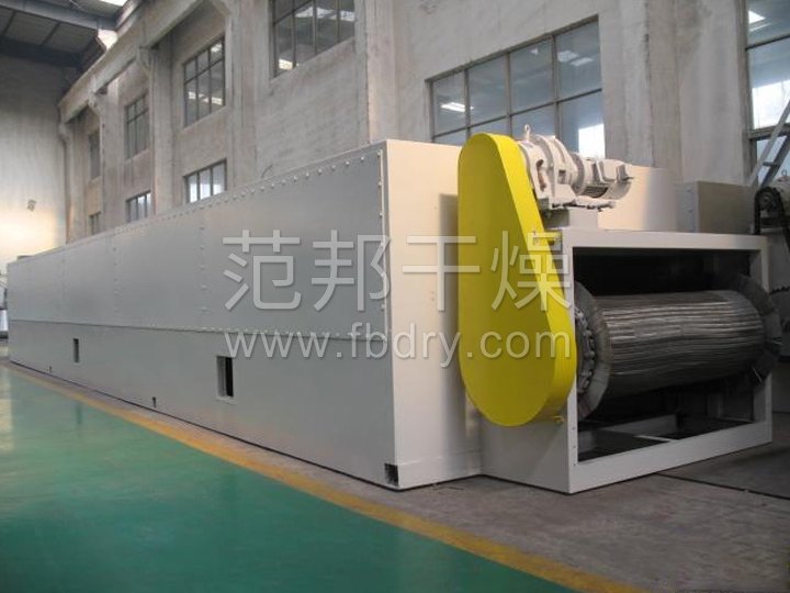 整个生产线为全封闭型(对物料而言),由摆动布料段、干燥段、出料段三部分组成。摆动布料段作用使海藻均匀分散在网板上,并且匀速输送到干燥段,海藻经过80℃热风干燥段,90℃热风干燥段和120℃热风干燥段后,再经过出料段排料。循环风向及各单元内风的循环为向下式,即加热后的空气由引风机吸入,在风机出风口首先预分布再经过孔板均风后,热风从物料的下面向上(或从物料的上面向下)穿透物料层。